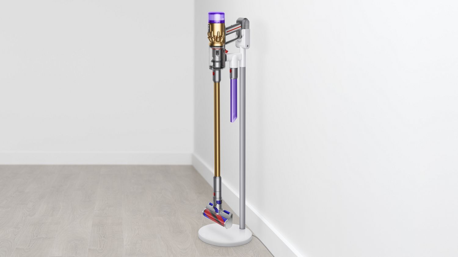 O aspirador Dyson Micro de 1,5kg cai na doca de carga montada na parede, pronto para a sua próxima limpeza.